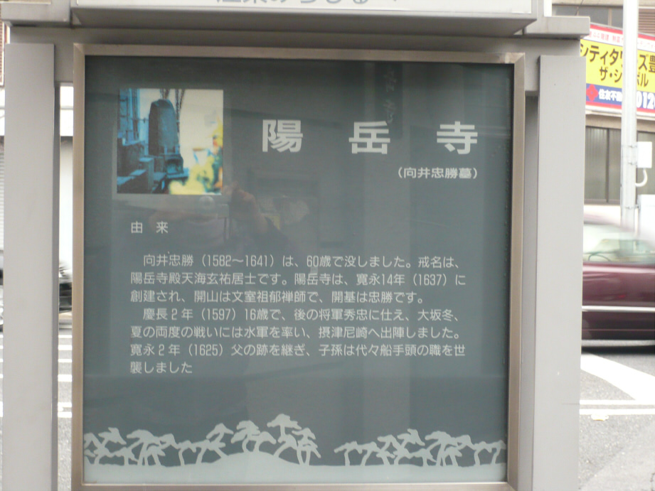陽岳寺すぐの歩道に陽岳寺の由来碑がある。由来碑には、陽岳寺向井忠勝墓の写真と忠勝について述べている。内容は以下のとおりである。